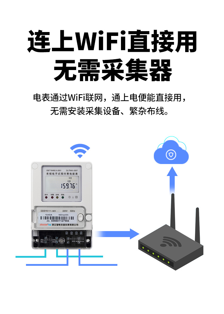 這種抄表方式在青年公寓,白領公寓,酒店式公寓采用比較多,這種方式直接聯(lián)上公寓里的wifi上遠抄服務器,再通過電腦診斷或手機app就能直接使用,這種智能電表使用量不大的情況下,用戶可自行采購安裝,WiFi電表安裝簡單方便,圖如下: