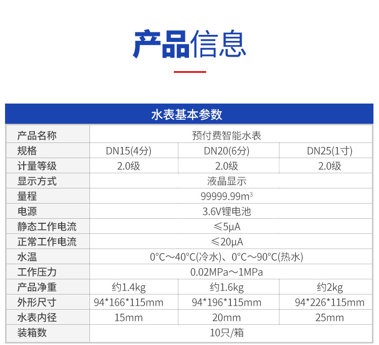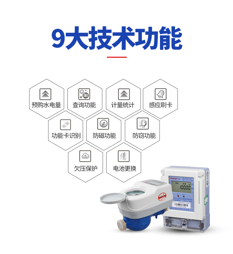 1、概述預(yù)付費水表是以旋翼式水表為基表,由干簧管取信裝置、低功耗電控閥門、微電腦控制系統(tǒng)、射頻卡信息系統(tǒng)集合而成的智能水表。該產(chǎn)品改變了傳統(tǒng)的用水收費方 式,由“先用水后交費”變?yōu)椤跋冉毁M后用水”, 每次售水收款都有記錄,解決了“收費難、賬目亂”這兩個水費管理工作中的難題。有遠(yuǎn)傳抄表功能的預(yù) 付費水表還可實時統(tǒng)計用水?dāng)?shù)量,為水費結(jié)算提供依據(jù)。產(chǎn)品符合國家標(biāo)準(zhǔn)GB/T778-2007《封閉滿管道中水流量的測量、飲用冷水水表和熱水水表》的全部技術(shù)要求。