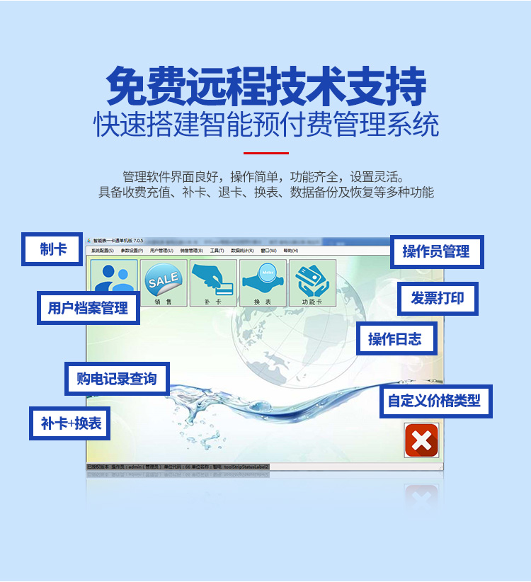 該管理軟件具備收費充值、補卡、退卡、換表、數(shù)據(jù)備份及恢復(fù)等多種功能。降低了物業(yè)管理成本,提高了工作效率,減小了勞動強度,水電費用提前收繳到位,而且?guī)つ繙?zhǔn)確、清晰。