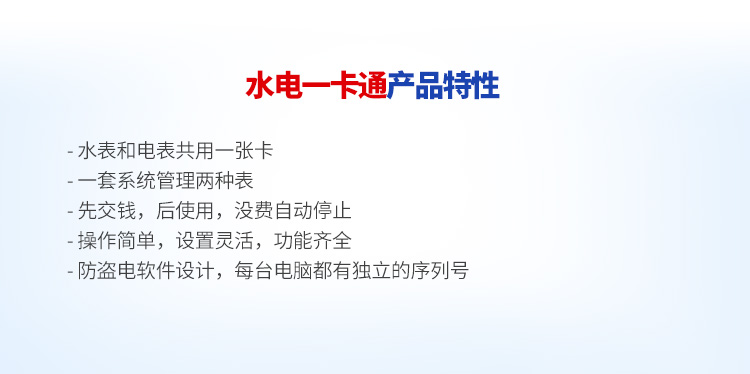 水電一卡通預(yù)付費管理系統(tǒng)由本公司生產(chǎn)的預(yù)付費電表、預(yù)付費水表、讀寫器和一卡通管理軟件構(gòu)成,物業(yè)管理部門可通過本系統(tǒng)完成對水費、電費和天然氣費的智能化管理,無需挨家挨戶抄表收費,由用戶通過一張IC卡購水購電,先交費,后用水用電,解決了抄表累、收費難的問題,該系統(tǒng)是物業(yè)管理部門的好幫手, 該管理軟件界面良好,操作簡單方便,易學(xué)易用,功能齊全。