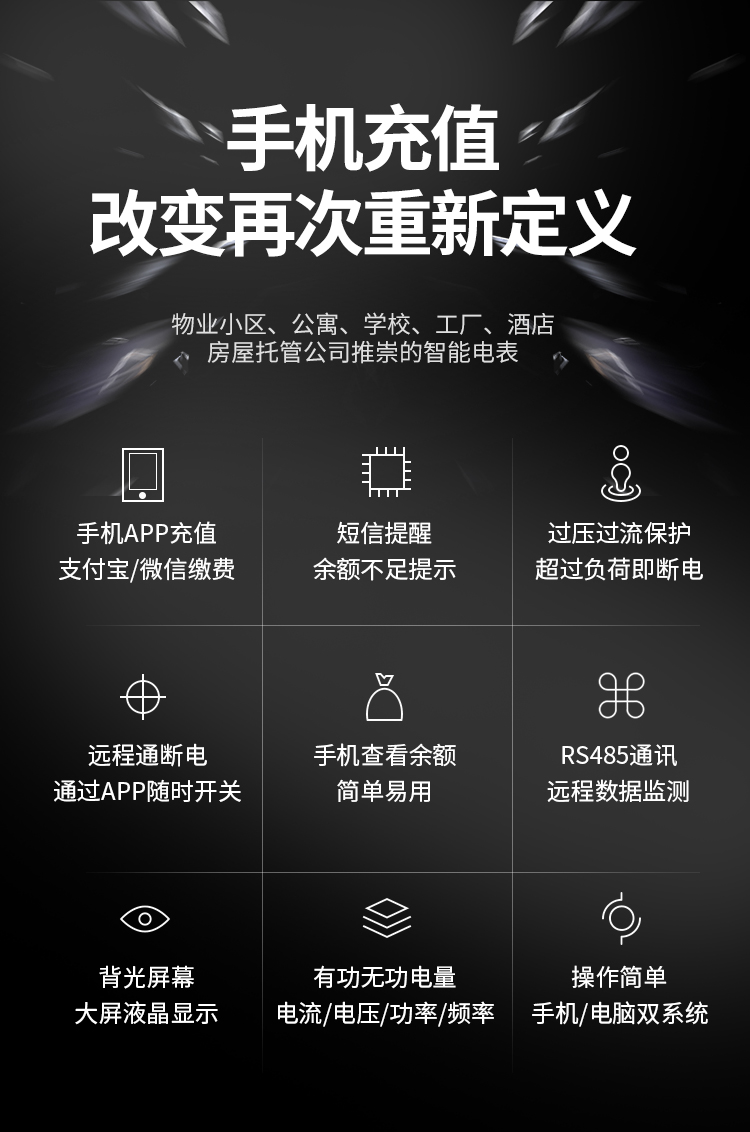 遠(yuǎn)程充值電表系統(tǒng)應(yīng)用小區(qū),寫(xiě)字樓,工業(yè)園,公寓,出租房,工廠,員宿舍,超市,市場(chǎng),商超等領(lǐng)域,改善現(xiàn)階段物業(yè)小區(qū)用電管理簡(jiǎn)陋,落后,用電管理不僅關(guān)系物業(yè)的經(jīng)濟(jì) 效益,而且和企業(yè)的社會(huì)責(zé)任密切相關(guān)。